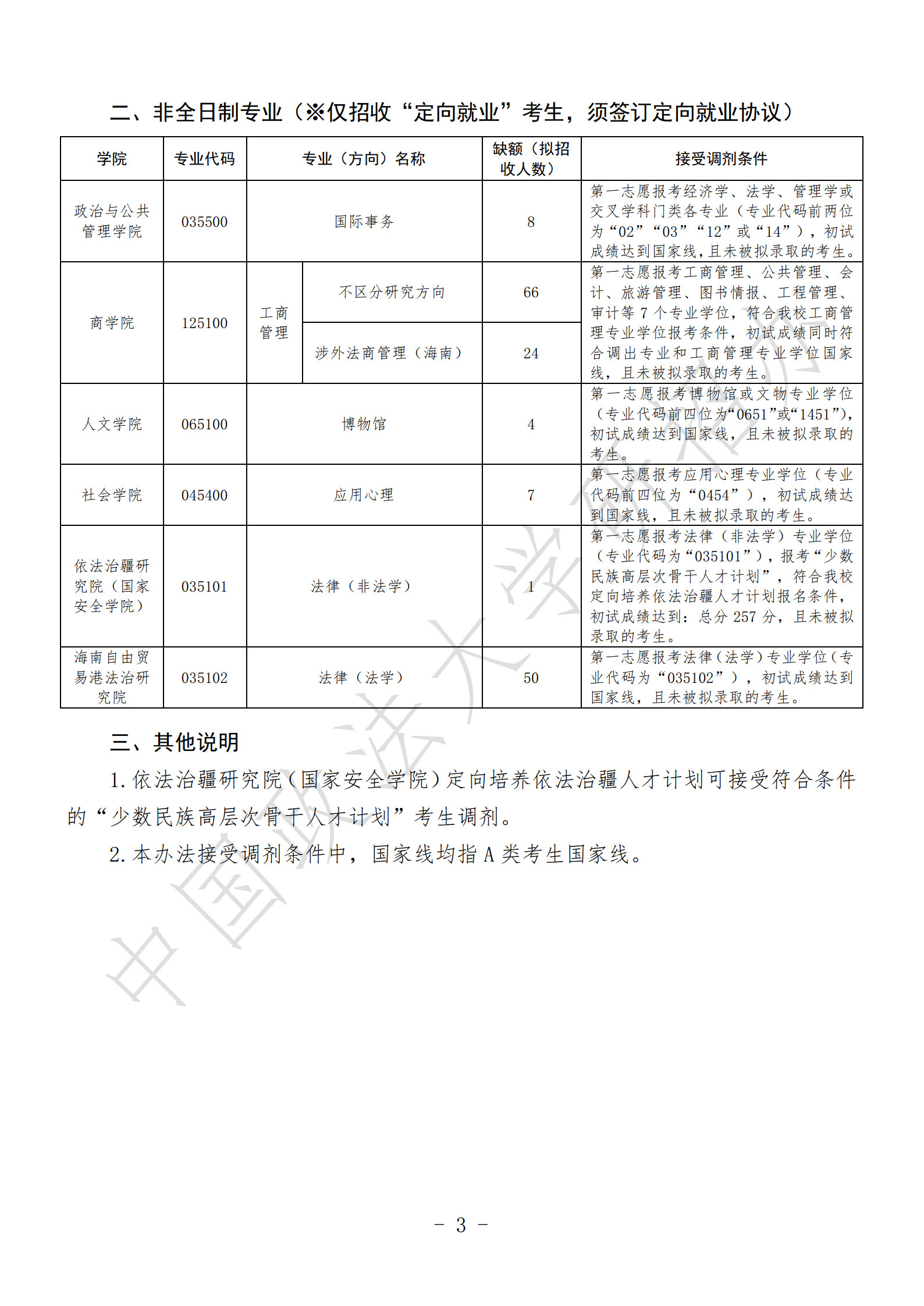 为做好我校2026年硕士研究生招生接受考生调剂工作,根据教育部《2026年全国硕士研究生招生工作管理规定》《关于做好2026年全国硕士研究生复试录取工作的通知》等文件精神,结合《中国政法大学2026年硕士研究生招生考试复试录取工作办法》和学校实际,制定本办法。 一、接受调剂专业目录及条件要求 我校接受调剂专业目录、缺额及接受调剂条件详见《中国政法大学2026年硕士研究生招生接受考生调剂专业目录及条件要求》(见附件)。 除特殊说明外,各专业不接受各类专项计划(包括单独考试、少数民族高层次骨干人才计划、援藏计划、退役大学生士兵计划)考生调剂。 申请调剂的考生除满足《中国政法大学2026年硕士研究生招生接受考生调剂专业目录及条件要求》外,还须符合《2026年全国硕士研究生招生工作管理规定》相关规定及我校《2026年硕士研究生招生章程》中规定的调入专业报考条件。 二、调剂复试比例 调剂复试采用差额形式,生源充足专业的复试比例一般不低于120%。各专业复试比例由各学院根据招生计划、申请调剂考生情况,结合往年调剂工作情况确定。 三、调剂工作程序 (一)考生网上填报调剂志愿 我校接受所有调剂考生(包括校内不同学院或专业之间考生调剂、报考外校调入我校、报考退役大学生士兵计划与普通计划之间调剂、报考全日制与非全日制之间调剂)均须通过“全国硕士生招生复试调剂服务系统”(以下简称“调剂系统”,4月8日0点开通)进行,严禁通过其他渠道接受考生调剂,或以“预调剂”“采集考生调剂意向”等为名变相开展调剂工作。 申请时间:工商管理(MBA)专业学位为4月8日0:00-12:00,其他专业为4月8日0:00-15:00。 申请网址:https://yz.chsi.com.cn/yztj 申请调剂的考生仅限填报我校一个学院一个专业的一个研究方向。同时填报我校多个志愿的,我校将以考生在调剂系统最后一次填报的志愿为准,其他志愿无效。 我校“非全日制”专业仅招收“定向就业”硕士研究生。对于申请调剂至“非全日制”专业的考生,如一志愿报考类别为“非定向就业”,我校将在录取前统一将录取类别修改为“定向就业”,考生须有可签订定向协议的就业单位方可被录取,并应按后续通知要求登录我校研究生招生平台填报定向就业单位等信息,在规定时间内签署定向就业协议。非全日制硕士研究生学习期间的学费、学制、奖学金、食宿等相关说明详见我校《2026年硕士研究生招生章程》。 申请享受初试加分的考生,若满足我校相关专业接受调剂条件,须在相关专业接受调剂申请结束时间之前,将本人有效居民身份证(正反面在同一页)、申请加分项相关证明材料提交至招生学院邮箱并电话联系学院进行确认(各学院邮箱及联系方式:点此查看)。 (二)招生学院遴选调剂复试名单 网上申请时间截止后,各学院将在满足申请条件的考生中,根据考生申请志愿、第一志愿专业、初试科目、初试成绩、专业背景、诚信情况等遴选进入复试的考生。对申请我校同一学院同一专业(或研究方向)、初试科目完全相同的调剂考生,我校将按考生初试成绩择优遴选进入复试的调剂考生名单。 各学院预计于4月9日前完成调剂复试名单遴选,并通过调剂系统向考生发送“复试通知”。“复试通知”中应注明考生确认复试通知的截止时间,未在规定时间内通过调剂系统确认接受我校调剂“复试通知”的考生,视为自愿放弃我校调剂复试资格,我校可取消其“复试通知”(即复试资格)。 (三)公布调剂复试名单 各学院确定调剂复试考生名单并报研招办审核通过后,按要求公布。调剂复试考生名单以各学院网站公布的名单为准。 (四)调剂复试 各学院根据本单位的调剂工作实施细则组织调剂考生复试,调剂复试安排经研招办审核通过后予以公布。 工商管理(MBA)专业学位调剂复试采用网络远程复试,于4月8日下午进行;其他专业采用现场复试,复试时间一般不早于4月10日。具体安排由复试学院制定并公布。 应用心理、工商管理(MBA)专业学位调剂复试考核方式为综合面试。应用心理专业学位综合面试包括专业课面试和外国语面试,工商管理(MBA)专业学位综合面试包括思想政治理论面试、专业课面试和外国语面试。以同等学力身份参加复试的考生,需在复试中进行加试,具体要求与安排由复试学院制定并公布。 进入调剂复试的考生应及时关注招生学院及研究生院网站调剂复试有关通知,按要求完成缴纳复试费、心理测试、提交复试资格审查材料等事项。对于进入我校2026年一志愿复试且缴纳过复试费的考生(一般为参加一志愿复试未获拟录取的考生),无需再次缴纳复试费;已完成心理测评的考生,无需再次参加测评。 (五)成绩计算 1.复试成绩计算 复试成绩满分为100分,其中复试各项成绩均按百分制折算,满分均为100分,计算公式一般为:复试成绩=专业课笔试成绩×30%+专业课面试成绩×50%+外国语面试成绩×20%。 报考应用心理专业学位考生的复试成绩=专业课面试成绩×80%+外国语面试成绩×20%。 报考工商管理专业学位考生的复试成绩=思想政治理论面试成绩×15%+专业课面试成绩×75%+外国语面试成绩×10%。 报考翻译专业学位考生的复试成绩=专业课笔试成绩×50%+专业课面试成绩×50%。 2.总成绩计算 总成绩满分为100分,计算公式为: 初试满分500分的,总成绩=初试总分÷5×50%+复试成绩×50%